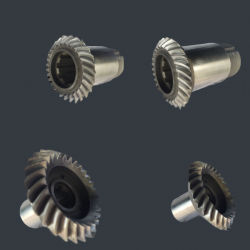 | Изготовление конических шестеренИзготовление конических шестеренКонические пары с прямым и круговым зубом до 6 класса точности до m-26, D- 2 500 мм (в т.ч. гипоидные пары) Конические зубчатые передачи, пары Конические зубчатые передачи представляют собой механизм, который состоит из скрепленных колес с зубьями. Их применяют для преобразования крутящих моментов и угловых скоростей для передачи вращательного движения. Конические пары необходимы, когда пересекаются приводные валы и нужно передать вращательное движение. Технология изготовления конических колес и валов-шестерен теснейшим образом связана с геометрией боковых поверхностей и профилей зубьев. Способ копирования фасонного профиля инструмента для образования профиля на коническом колесе не может быть использован, так как размеры впадины конического колеса изменяются по мере приближения к вершине конуса. В связи с этим такие инструменты, как модульная дисковая фреза, пальцевая фреза, фасонный шлифовальный круг, можно использовать только для черновой прорезки впадин или для образования впадин колёс не выше восьмой степени точности. Для нарезания более точных конических колёс используют способ обкатки в станочном зацеплении нарезаемой заготовки с воображаемым производящим колесом. Боковые поверхности производящего колеса образуются за счёт движения режущих кромок инструмента в процессе главного движения резания, обеспечивающего срезание припуска. Преимущественное распространение получили инструменты с прямолинейным лезвием. При прямолинейном главном движении прямолинейное лезвие образует плоскую производящую поверхность. Такая поверхность не может образовать эвольвентную коническую поверхность со сферическими эвольвентными профилями. Получаемые сопряжённые конические поверхности, отличающиеся от эвольвентных поверхностей, называют квазиэвольвентными. Гипоидная передача (гиперболоидная)- вид винтовой зубчатой передачи, осуществляемой коническими колёсами (с косыми или криволинейными зубьями) со скрещивающимися осями (обычно 90°). Гипоидная передача имеет смещение по оси между большим и малым зубчатыми колесами. Колёса гипоидной передач могут иметь косые, или криволинейные, зубья; угол скрещивания осей обычно равен 90°. Передаточное число большинства передач не превышает 10, однако в некоторых случаях достигает 30 и более. Нагрузочная способность по сравнению с др. передачами со скрещивающимися осями выше благодаря линейному контакту зубьев и увеличению числа пар зубьев, находящихся в зацеплении. В гипоидной передаче обеспечивается хорошее притирание сопряжённых поверхностей; этим объясняется плавная и бесшумная работа передачи. При тех же Dk и i шестерня имеет больший размер, чем обычная коническая; это позволяет увеличить диаметр вала шестерни и т. о. сделать его более жёстким, применить подшипники большего размера, т. е. повысить их долговечность. Недостатком является повышенная опасность заедания, обусловленная скольжением вдоль линий контакта зубьев. Это явление сопровождается снижением несущей способности масляного клина. Опасность заедания устраняется применением противозадирной смазки (гипоидного масла) и термической обработкой зубьев, обеспечивающей высокую твёрдость их поверхности. Часто используется как главная передача