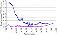 Типичная зависимость изменения концентрации ТСС от времени в потоке амина показана на рис. 3.