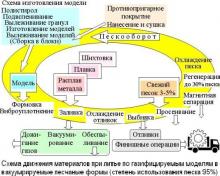 Оборотное охлаждение песка после высыпания из форм ведут в проходных охладителях - в пневмопотоке или барабанных, как правило, монтируя их с бункерами вне цеха (песок не боится мороза). Для черных и цветных сплавов используют одинаковое отечественное оборудование (в отличие от традиционной формовки со связующим, когда качественное оборудование бычно импортируют). Так получают отливки из чугуна и стали всех видов, бронзы, латуни и алюминия всех марок. В ящике на «елке или кусте» сразу льют десятки отливок, как в ювелирном производстве.