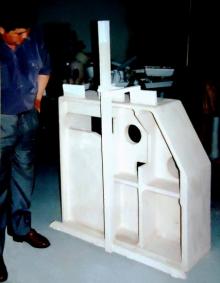 Свободно можно видеть объемный прообраз отливки в модели, померять ее стенки, чего при обычной формовке для сложных с несколькими стержнями отливок не сделать. Модель из пенопласта легче отливки из чугуна в 280 раз, возьмешь в руки модель – как будто держишь пустоту, которая затем превращается в металл. Обычно литейщики к такому не привыкли, стереотипы заложенные еще в институте, не дают увидеть новых возможностей литья. Пенопластовые модели покрывают краской с огнеупорным порошком, склеивают с литником, засыпают сухим песком в ящике (контейнере) и заливают металлом. При заливке металл испаряет модель и собой ее замещает. Чтобы модель не дымила в цех при заливке, из контейнера отсасывают насосом газы – разрежение поддерживают примерно пол-атмосферы (бытовой пылесос дает до 0,3 атм). Нет вони горелых связующих, нет заливов по разъему форм (нет разъема) и смещения стержней и форм при сборке, т. к. отсутствуют сами стержни со всеми проблемами их производства и выбивки.