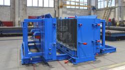 Двухместная вертикальная металлоформа для лестничных маршей спроектирована с акцентом на оперативную переналадку и удобство съёма изделий. Габариты формы — 3399,5×3954×1623,5 мм.