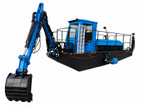 Особенностью этой установки является поворотная экскаваторная стрела с возможностью смены насадок: (ковш, ковш-вилы, фрезерный рыхлитель с насосной установкой). Данная установка способствует захвату грунта со дна водоема, с последующей разгрузкой на берег. Сваи позволяют зафиксировать земснаряд на водоеме во избежание движения во время выполнения работ. Оборудован маневровыми гидравлическими моторами для передвижения на водоеме со скоростью до 5-и км/час.